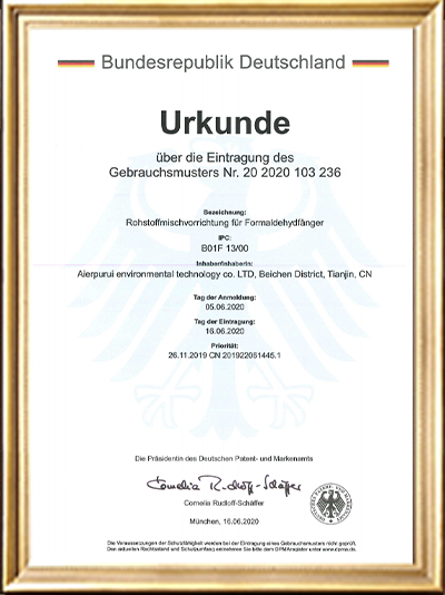 • 實用新型專利證書(一種甲醛清除劑的原料加載
