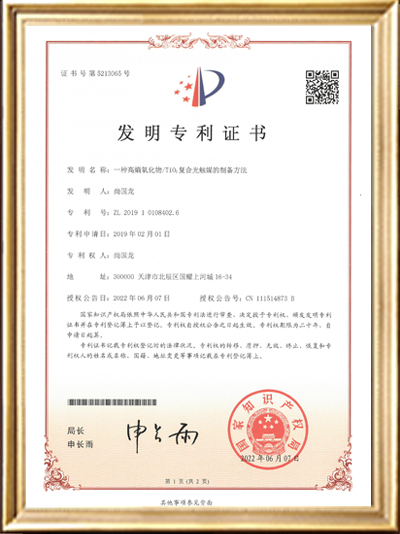 • 發明專利證書證書(一種高稿氧化物/Ti02復合光觸